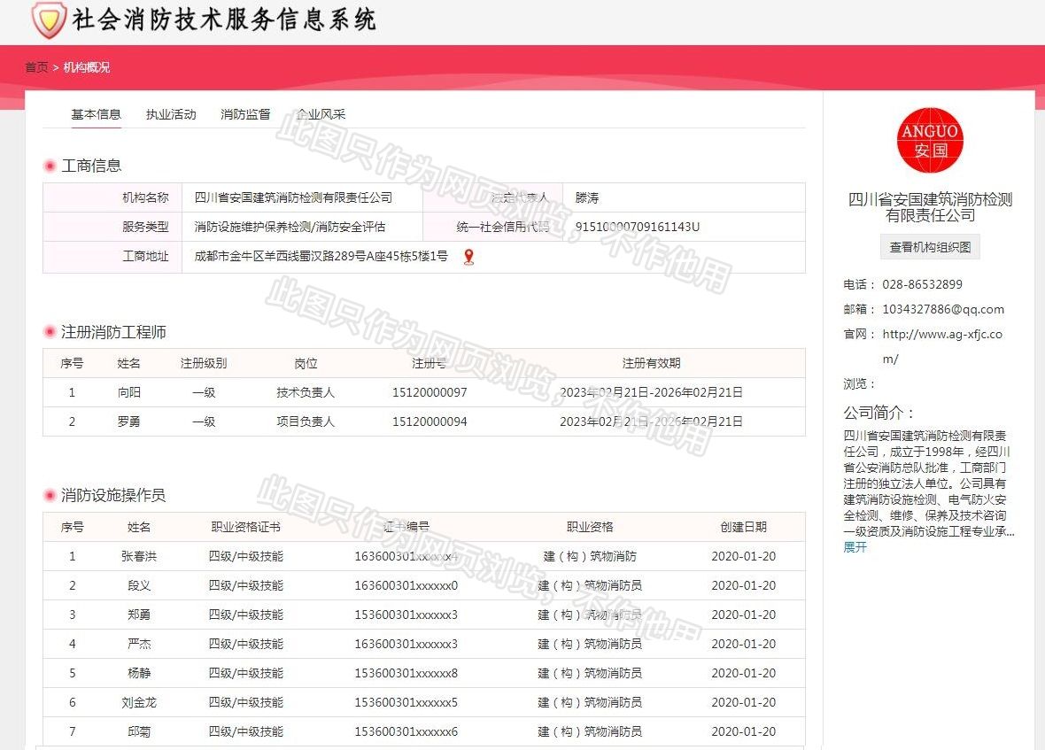 四川省安國建筑消防檢測有限責(zé)任公司,成立于1998年,經(jīng)四川省公安消防總隊批準,工商部門注冊的獨立法人單位。